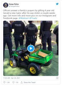 Patrol Sergeant Andrew Brooks’ wife came across the Facebook post and shared it with her husband. Sergeant Andrew Brooks rallied together Tempe officers in order to find the stolen tractor. After efforts to find the vehicle failed, Brooks was able to find another way around the situation. With the financial support from an area Walmart, the Tempe Officers Association was able to buy the boy a sparkling, new tractor.